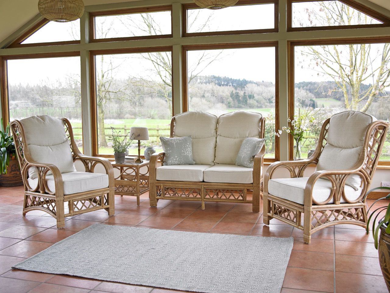 The Bridgend conservatory furniture set is only available online and offers exceptional value. A two-seater sofa and two armchairs are included in each set, with cushions covered in the cream fabric shown. It is very comfortable with a supportive high back and beautifully-made, decorative, curved rattan arms that have a smooth top surface. The deep cushions are covered in a soft-feel, cream fabric. A matching side table is also available separately.