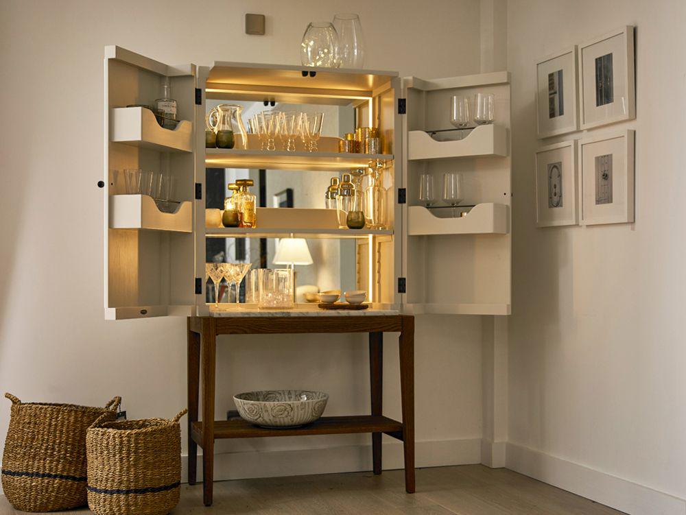 Ardingly is a storage cupboard with multiple personalities. Made from painted tulipwood and dark oak, it is, at its most basic, the ideal kitchen larder. You can even add a lower shelf to store those baskets of seasonal veg and a marble base to keep things cool. You can choose to have a mirrored back and light up your cocktail paraphernalia with the built-in, dimmable LEDs. The internal shelves are adjustable and removable, so you can tuck your TV away when guests arrive. And, thanks to thoughtful cable management slots, you can even use Ardingly as an office workstation.