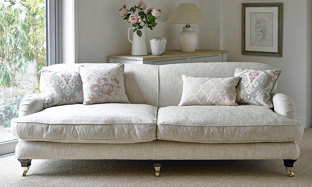The gorgeous Emile sofa is both up to the minute and beautifully traditional. Vintage-style and a perfect shape to show off faded floral fabrics. With deep feather seat cushions and a sprung frame, it could not be more comfortable. Made in Britain using superior grade materials and a solid hardwood frame, it is made to order - you can choose your fabric from a lovely selection of plain linens and vintage florals and even specify measurements if you need to. If you prefer a firmer seat, you can choose feather Encore cushions There are three standard sizes of sofa and an armchair in this range.