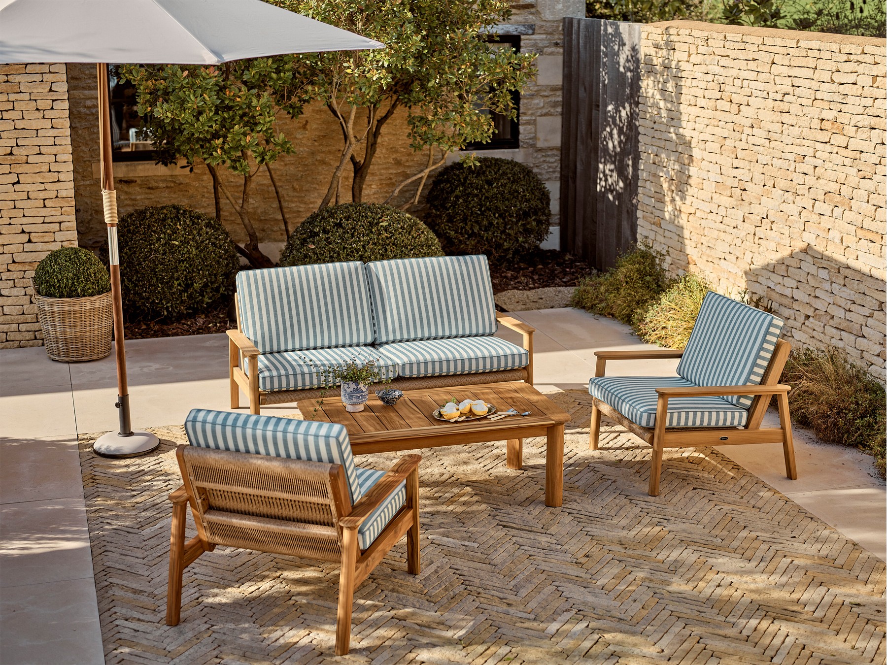 The Kew collection of contemporary teak garden seating will add style to any terrace of patio. Solid teak frames with panels of hand-woven all-weather rattan and finished with deep cushions in a bold, blue stripe or neutral water resistant fabric. There is an armchair, two-seater sofa and coffee table in this collection.