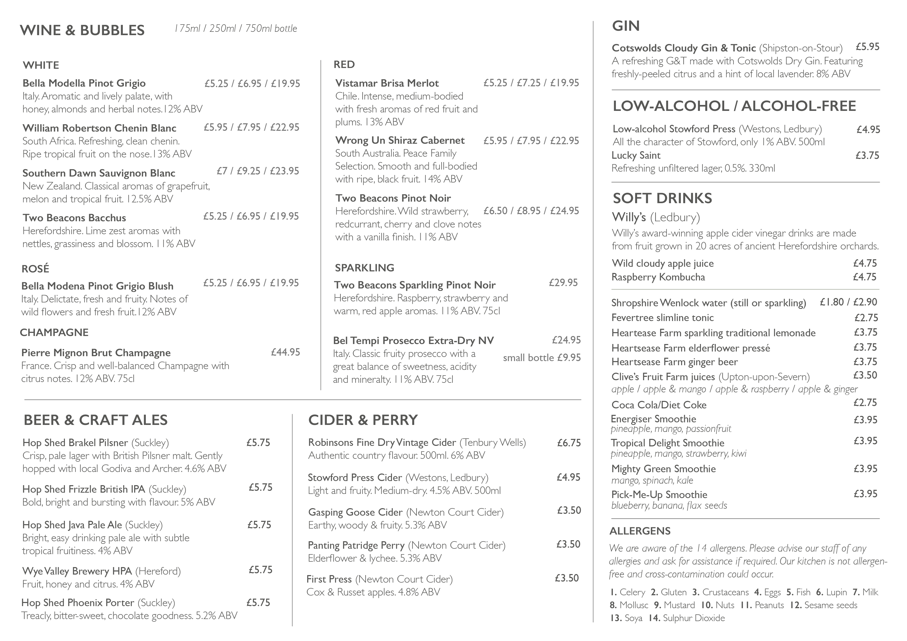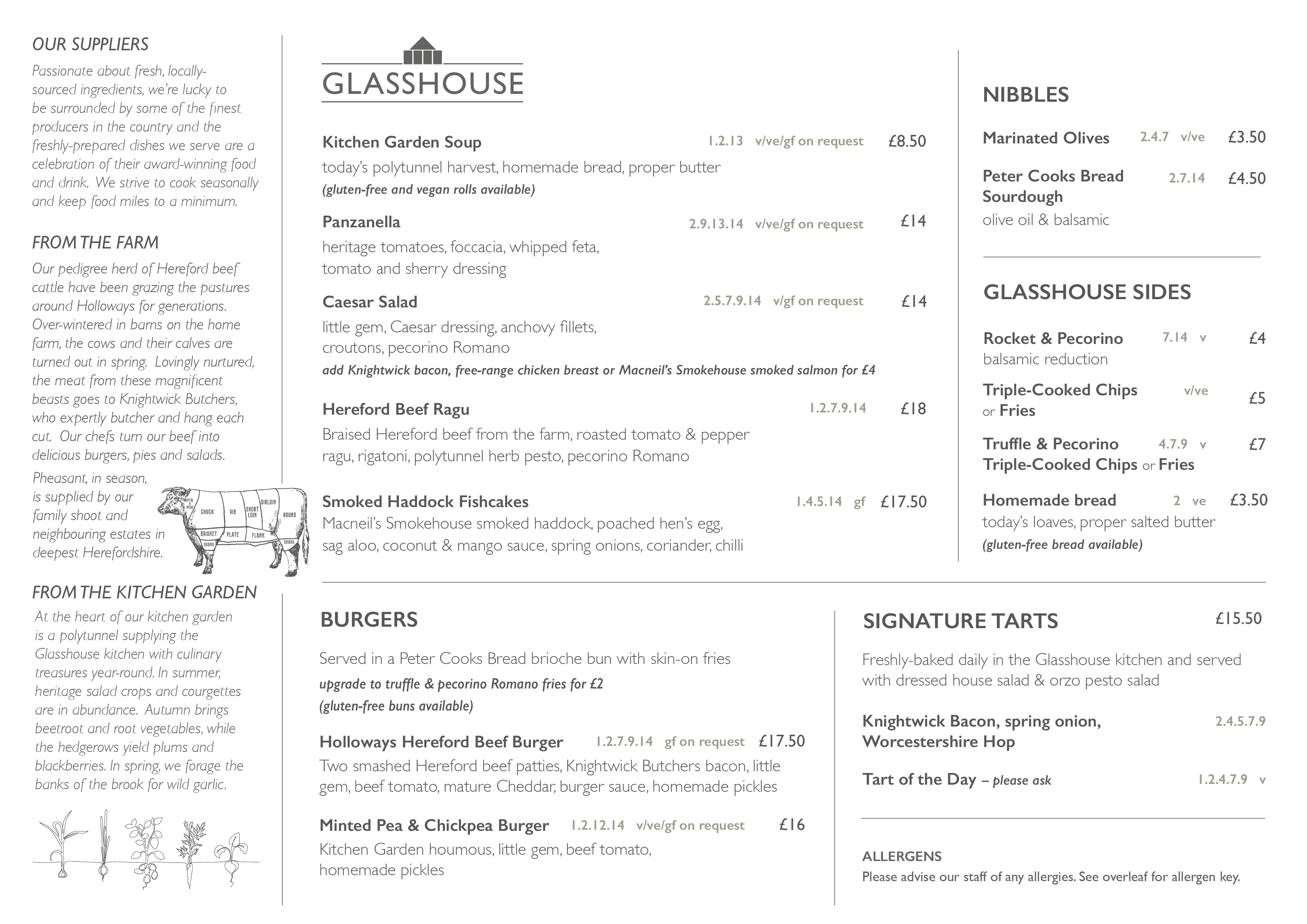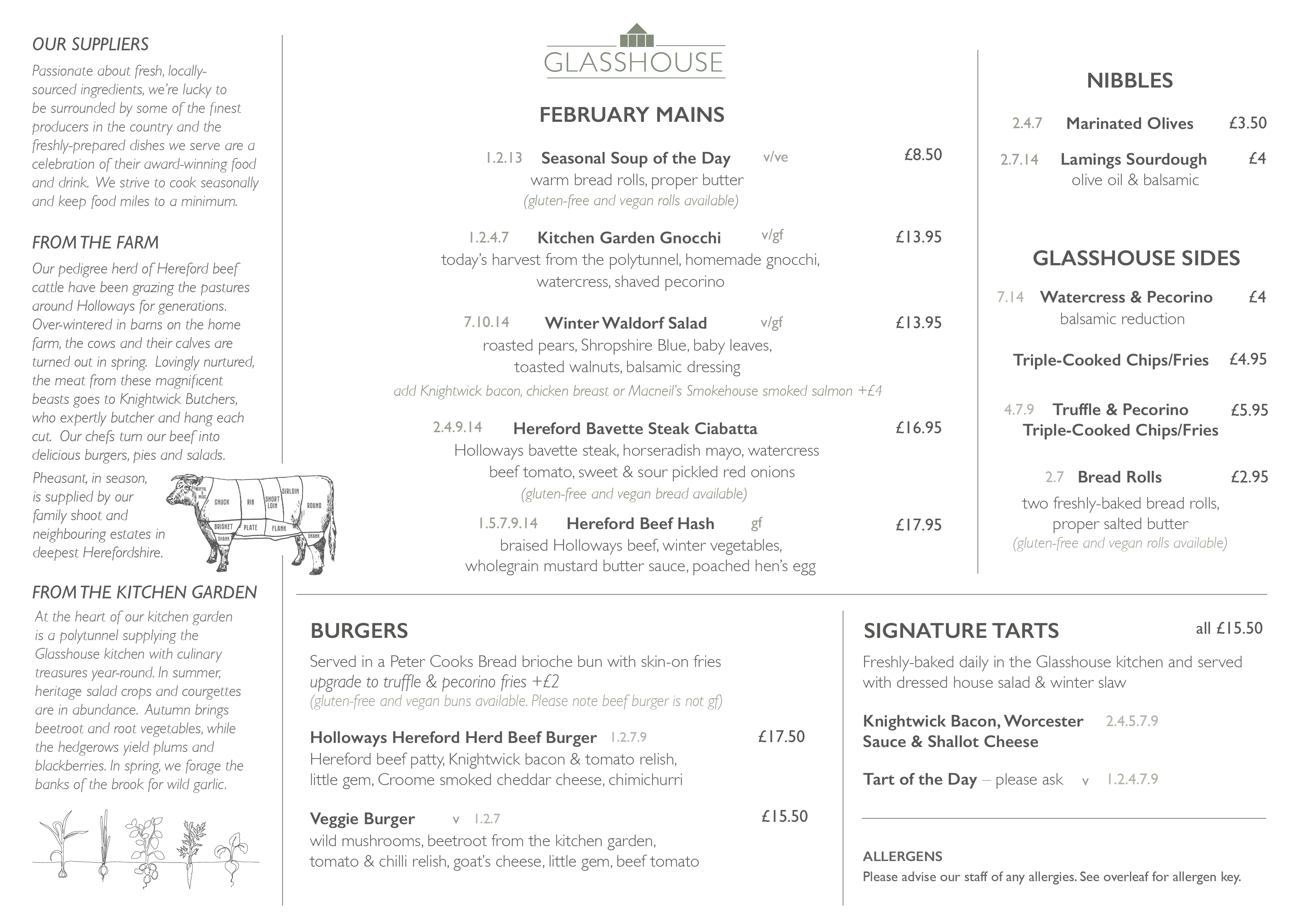 Created using hero ingredients from award-winning local suppliers, our ever-changing seasonal menus feature our home-grown Hereford beef, fish and shellfish dishes, homemade burgers, Kitchen Garden soups and our famous Glasshouse tarts. There are tempting puddings, an appealing children's menu and a full wine list with local ales and ciders.