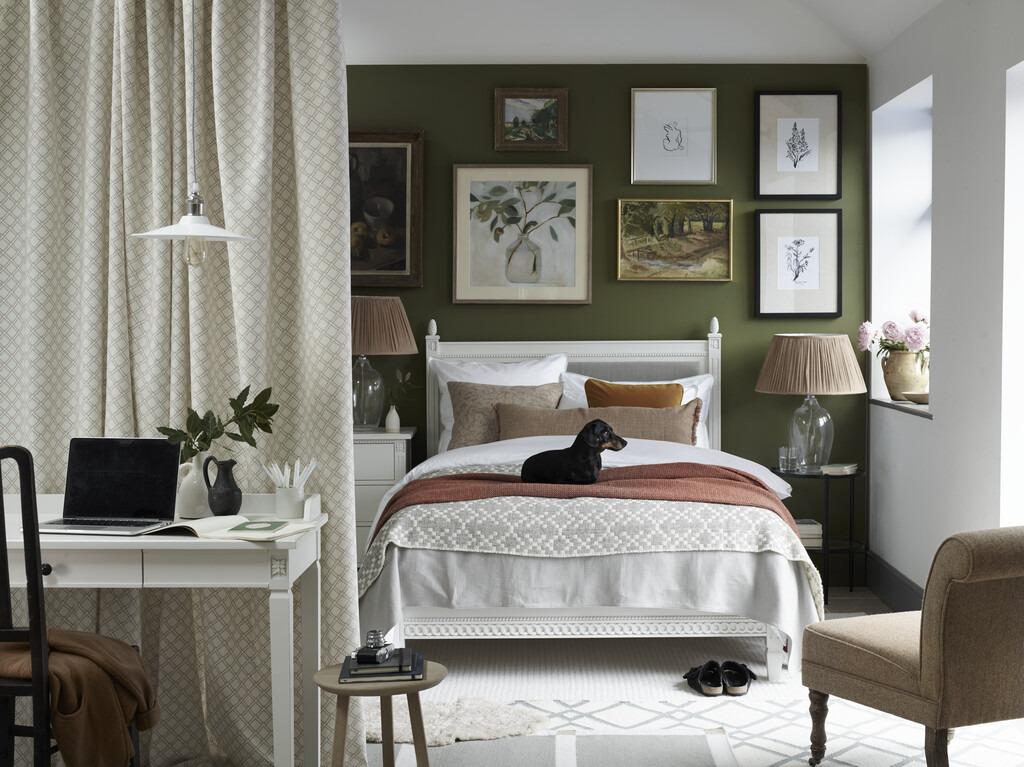 With an unmistakably cocoon-like feel, olive walls in a bedroom pair beautifully with crisp white linen and dusky pink accents - they sit opposite each other on the colour wheel. Add glass lamp bases with silk shades, jugs of seasonal foliage and hints of brass for a serene, soothing, verdant look. Try this Larsson bed, with its Chloe Trellis stonewashed upholstered linen headboard and cool Scandinavian design. It's set off perfectly by our Shaftesbury lamp.