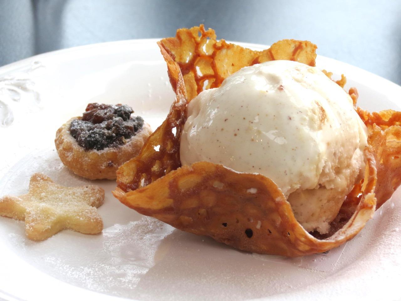 Homemade brandy snap baskets are featured on our Christmas lunch menu at The Glasshouse Café this year. We have filled our baskets with a luxury Christmas pudding ice cream, made in Worcestershire. Scrumptious!
