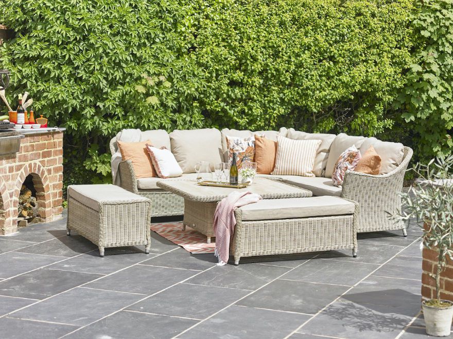 This larger Tetbury casual dining sofa set, again in Cloud weather-proof wicker, seats nine and comes with a comfortable armchair and matching dining bench and a larger adjustable-height table.