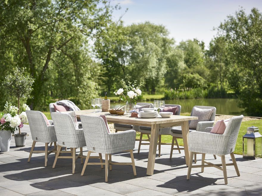 The Derby teak 240cm table is also available in a set with six Avila dining chairs in Pebble-coloured Hularo wicker, with comfortable seat pads, guaranteed for 10 years.