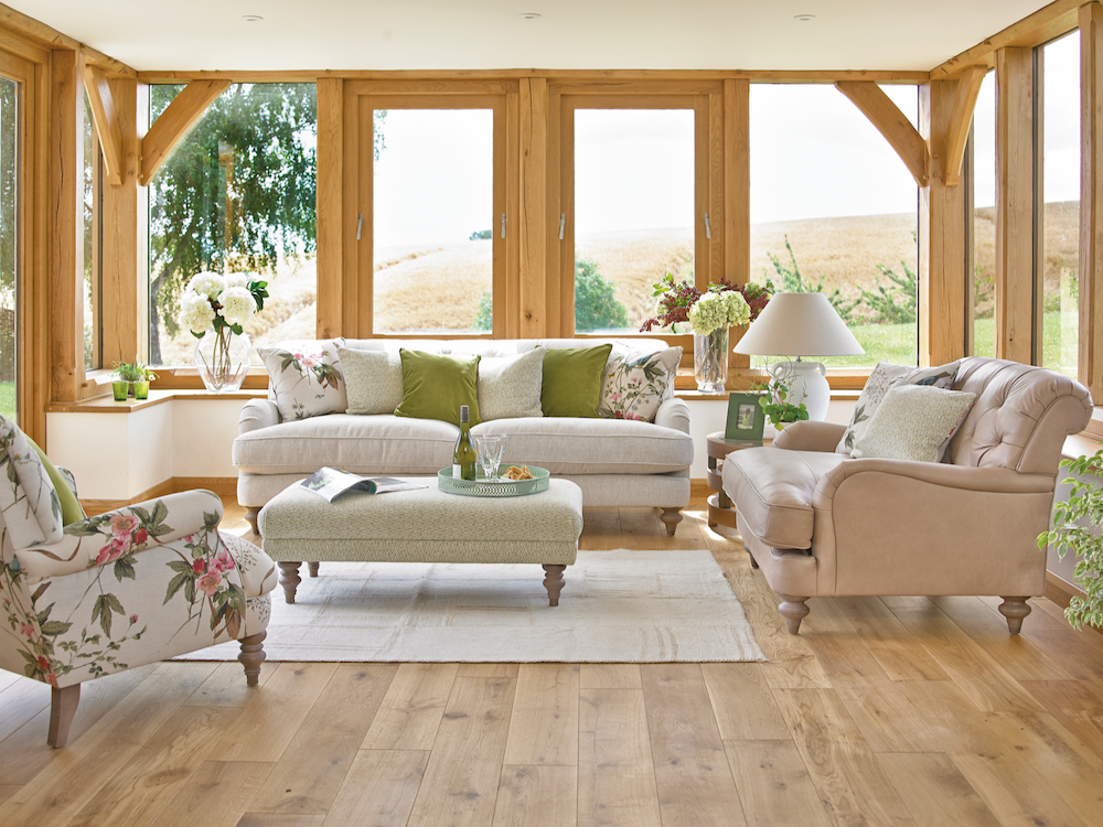 This button-back Artisan armchair, with its turned wooden legs, or the Mimosa love seat, is the perfect focal point for a contemporary country sitting room.