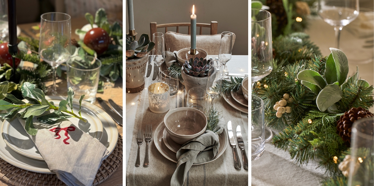 For festive dining, pair hand-thrown, textured tableware with linen napkins and understated centrepieces. A rustic wooden table can be dressed with a eucalyptus centrepiece, candles in mixed heights, and perhaps a few handmade touches like kraft-paper place cards. Use muted tones and natural elements to achieve a look that’s effortlessly chic. Read our Interior Designer Annie Blackledge's blog on effortless hosting and the art of Christmas tablescaping.