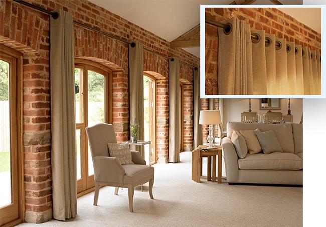 In this converted barn, with a wall of windows, we thought that a wall of sheer fabric provided piracy, but still allows plenty of light to come in. We used a contemporary eyelet heading hung from a pole well above the height of the window. Almost disappearing during the day, at night the curtains make the room feel warm and private.