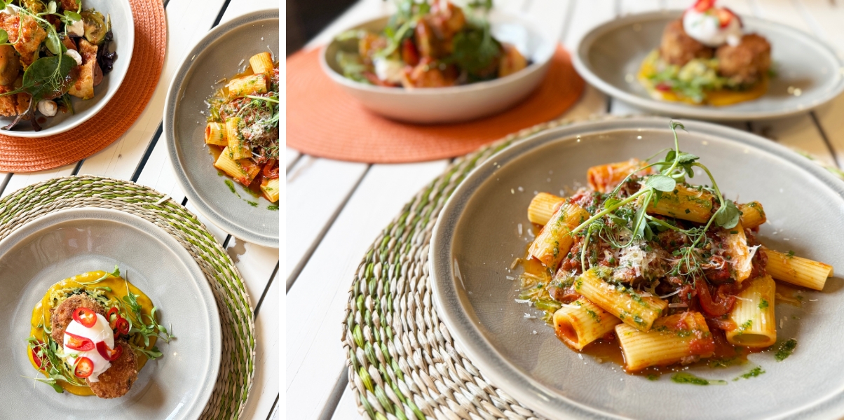 Beef from our Hereford herd is, as ever front and centre. This month, shin braised low and slow is stirred into a rich, roasted tomato and pepper ragu and served with rigatoni and pesto made from our polytunnel herbs. Smashed patties make up our new burger, piled high with little gem, beef tomato, mature Cheddar, homemade burger sauce and kitchen pickles.