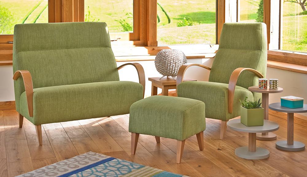 Barcelona sofa, armchair and footstool covered in practical Naomi Aquaclean fabric