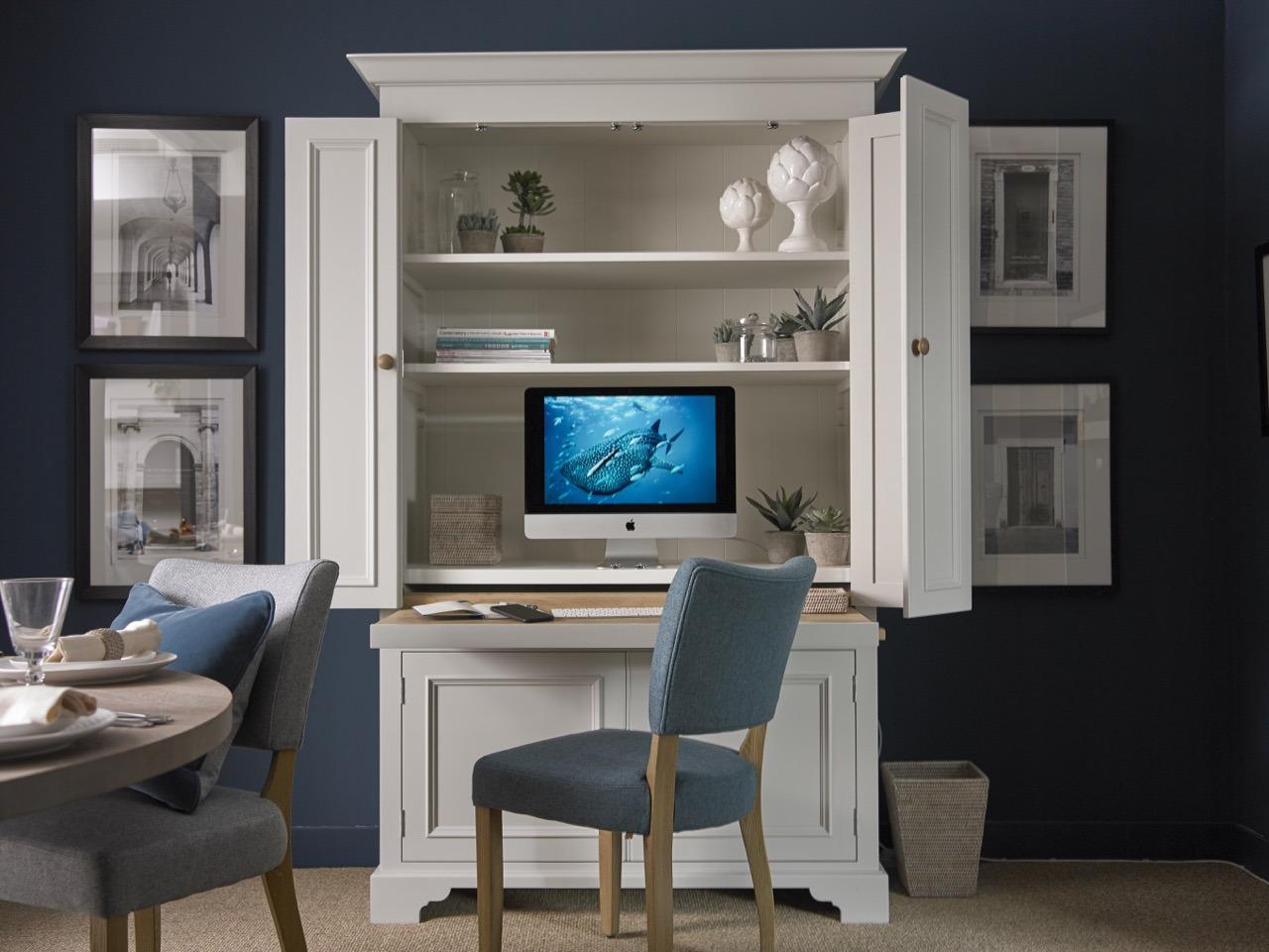 Have you thought of making more use of your dining room by re-purposing it as a family home office - a place for homework, private study, admin, getaway planning, photo-sharing and family meals. Planned properly and using furniture designed for the job, you can create working spaces that will help to make home-working, or just paying the bills, more enjoyable. And keep your home looking beautiful. The Oxford home office furniture, with its solid oak table for meetings and gatherings, makes this a working room that the whole family can use and enjoy. A room that works!